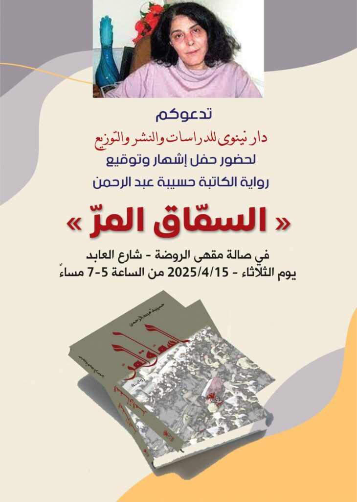 يسرنا في مبادرة القلم السوري أن نشارككم دعوة دار نينوى للدراسات والنشر والتوزيع لحضور حفل إشهار وتوقيع رواية “السُقّاق المُرّ” لزميلتنا عضوة المبادرة، الكاتبة والمناضلة السياسية