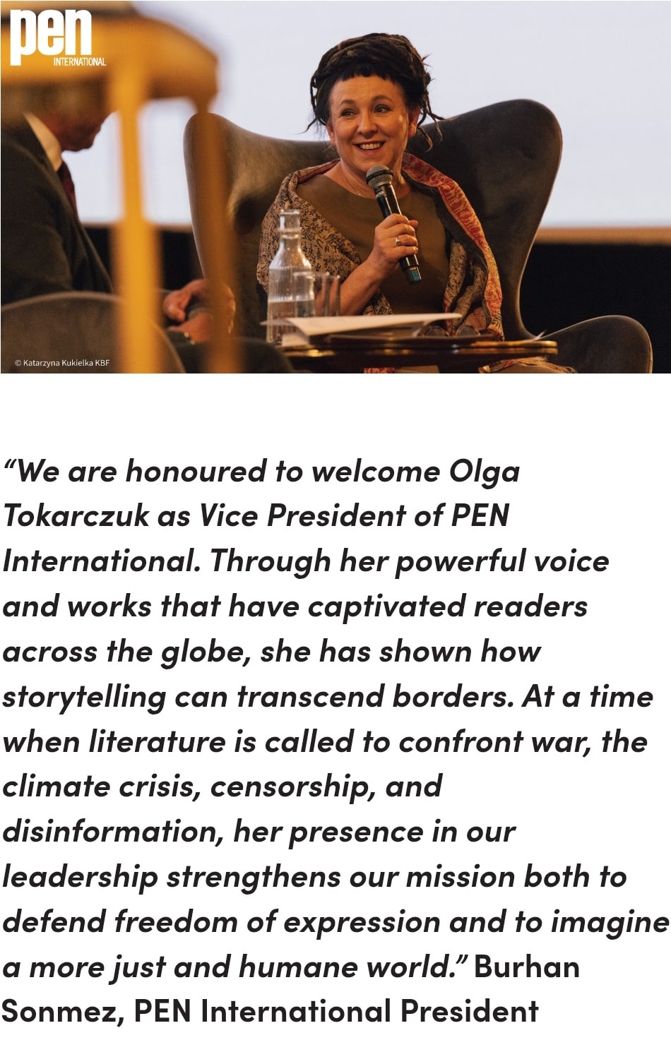 “يشرفنا أن نرحب بأولغا توكارتشوك نائبةً لرئيس منظمة القلم الدولية. من خلال صوتها القوي وأعمالها التي أسرت قلوب القراء حول العالم، أظهرت كيف يمكن لسرد القصص أن يتجاوز الحدود. في وقتٍ يُستدعى فيه الأدب لمواجهة الحرب وأزمة المناخ والرقابة والتضليل الإعلامي، فإن وجودها في قيادتنا يعزز مهمتنا في الدفاع عن حرية التعبير وفي تصوّر عالم أكثر عدلاً وإنسانية.”