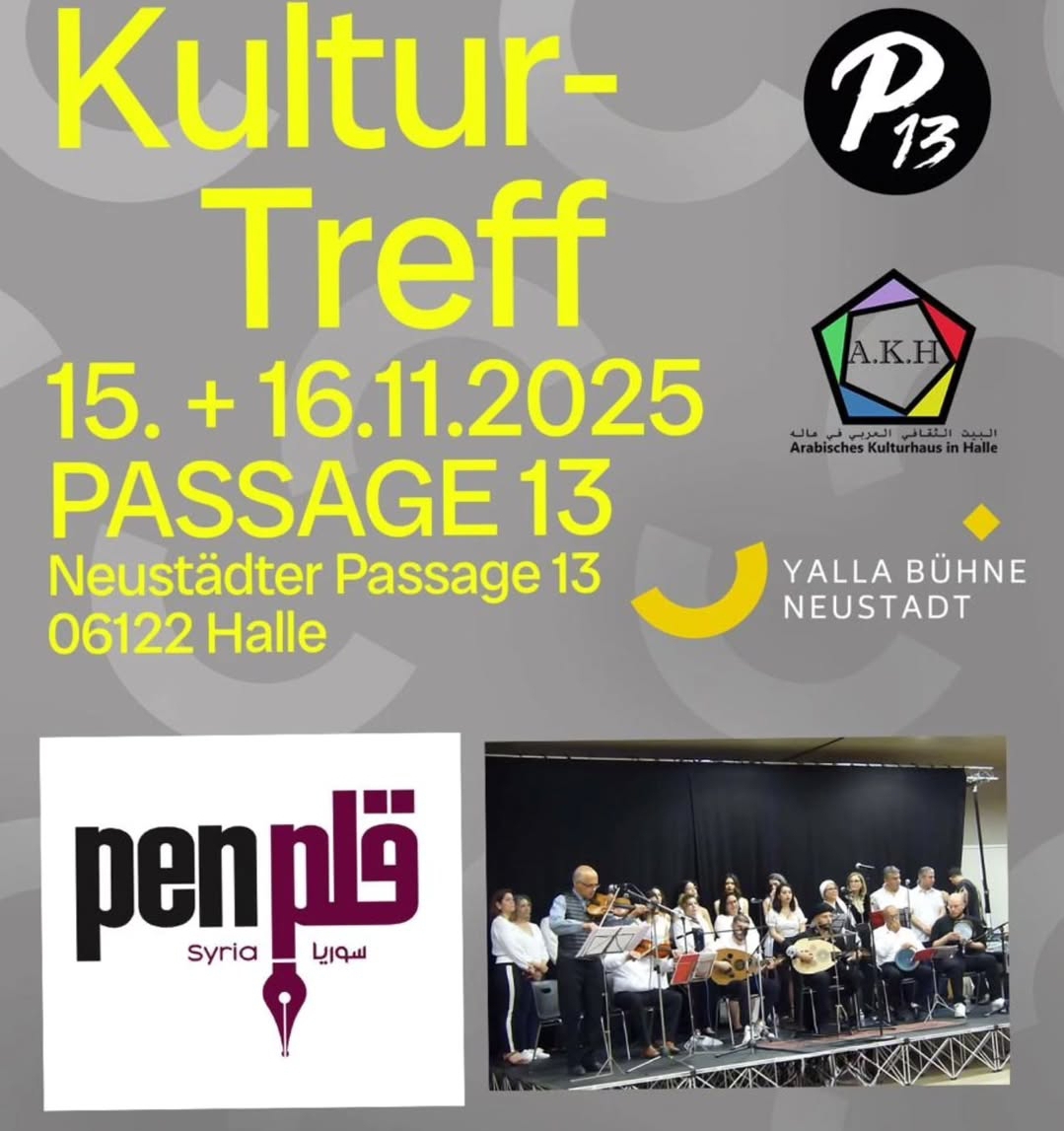 دعوة عامة مركز القلم السوري بالتعاون مع البيت الثقافي العربي في هاله زاله يتشرف بدعوتكم/ن لحضور ملتقى الأدب والفن وذلك يوم السبت 15.11.2025 الساعة 18:30 برنامج الملتقى الافتتاح: فقرة فنية مع كورال ديرلانجيه ندوة حوارية: مركز القلم السوري/منظمة القلم الدولية وقضية حرية الرأي والتعبير في سوريا فيلم قصير: عرض فيلم…