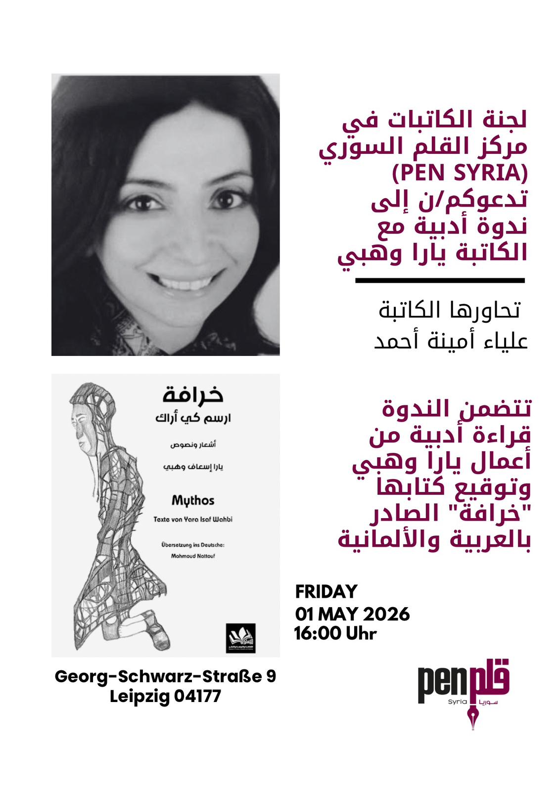 دعوة عامة تتشرّف لجنة الكاتبات في مركز القلم السوري – PEN Syria بدعوتكم/ن إلى ندوة أدبية مع الكاتبة يارا وهبي، تحاورها الكاتبة علياء أمينة أحمد يوم الجمعة 1 أيار/مايو 2026 الساعة 16:00 على العنوان Georg-Schwartz-Str.9 ستقرأ يارا بعض نصوصها وتوقّع نسخاً من كتابها “خرافة” الصادر بالعربية والألمانية يارا وهبي: كاتبة…